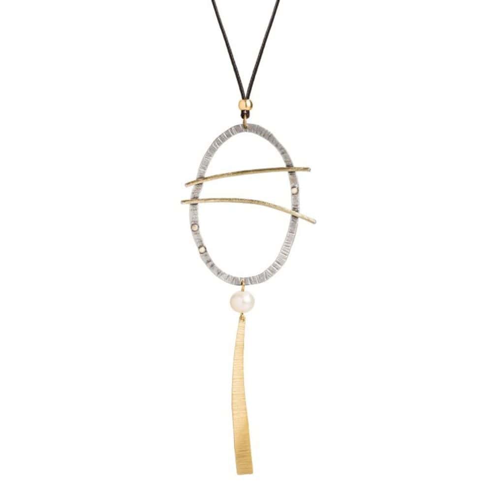 Χειροποίητο μακρύ κολιέ από επιχρυσωμένο ορείχαλκο και αυξομειούμενο δερμάτινο κορδόνι.