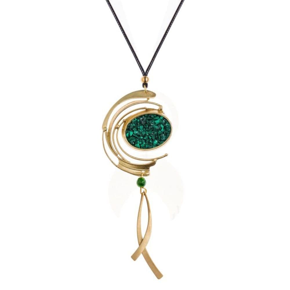 Χειροποίητο μακρύ κολιέ από ορείχαλκο ,πέτρα μαλαχίτη και δερμάτινο κορδόνι.