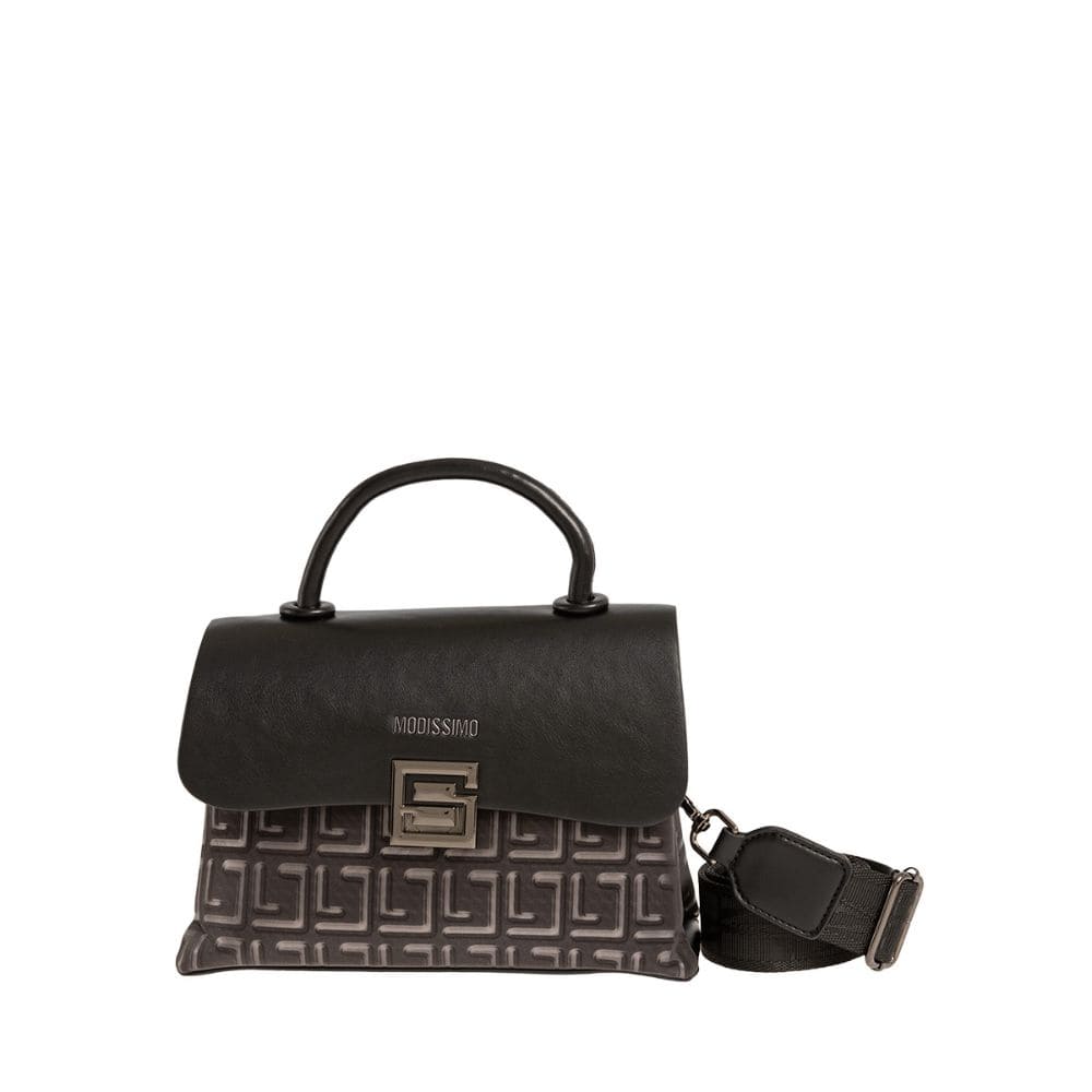 Γυναικεία τσάντα χειρός από συνδυασμό ανθεκτικού συνθετικού δέρματος δύο υφών. Κλείνει με μεταλλικό μαγνητικό κούμπωμα και φερμουάρ και το εσωτερικό του χωρίζεται σε δύο θέσεις. Στο εσωτερικό του υπάρχουν επίσης δύο πλαϊνά βοηθητικά τσεπάκια, το ένα εκ των οποίων κλείνει με φερμουάρ. Στην πίσω όψη υπάρχει τσέπη με φερμουάρ. Περιέχει ρυθμιζόμενο μαύρο ιμάντα με το λογότυπο για χιαστί εφαρμογή ή εφαρμογή στον ώμο.