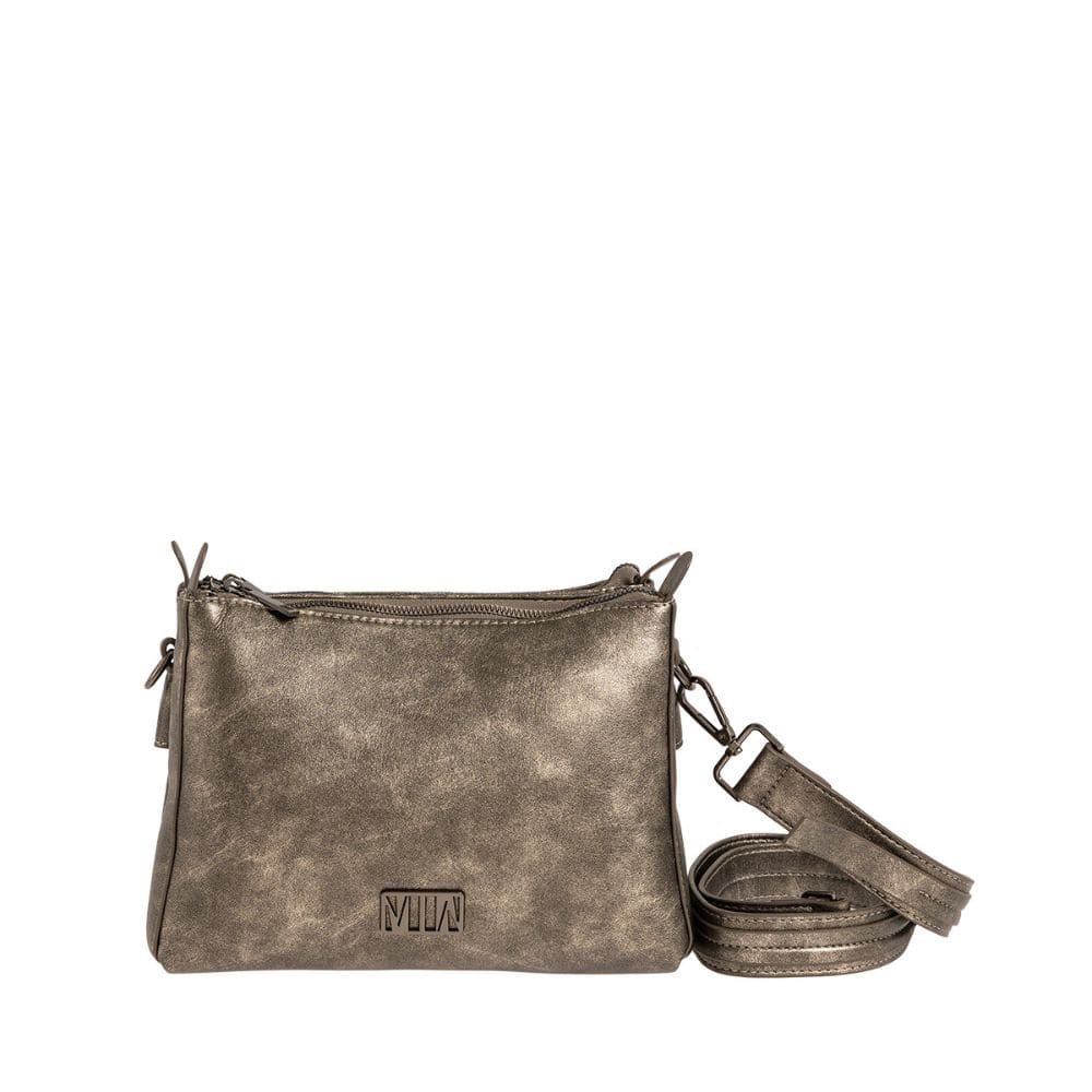 Γυναικεία τσάντα από ανθεκτικό συνθετικό δέρμα. Έχει δύο ανεξάρτητες θήκες που κλείνουν με φερμουάρ και στο εσωτερικό της υπάρχουν δύο πλαϊνά βοηθητικά τσεπάκια, το ένα εκ των οποίων κλείνει με φερμουάρ. Στην πίσω όψη υπάρχει επιπλέον τσέπη με φερμουάρ. Περιέχει δύο λουράκια, το ένα από συνθετικό δέρμα για εφαρμογή στον ώμο και το δεύτερο από μαύρο ιμάντα με το λογότυπο για χιαστί εφαρμοφή